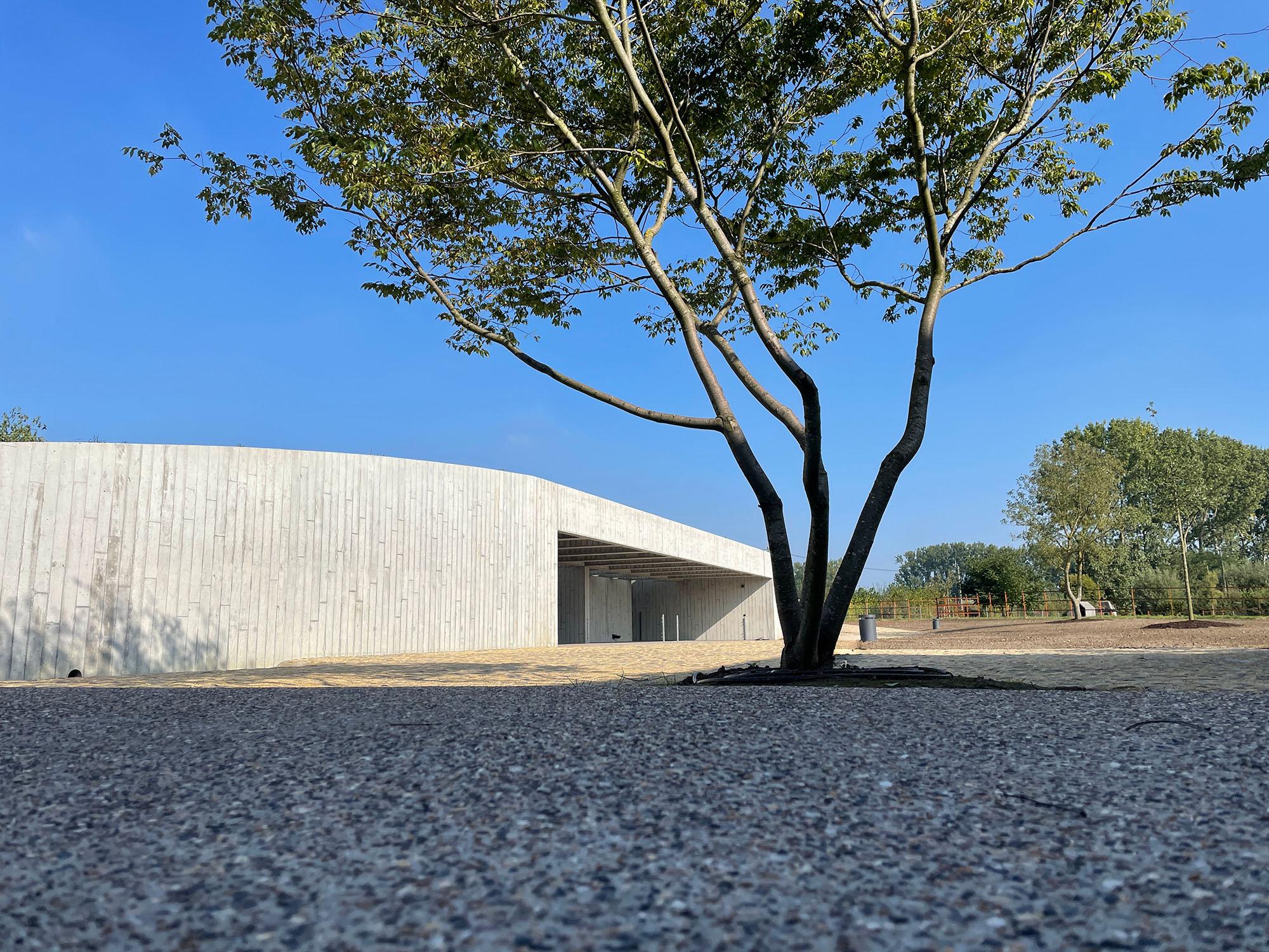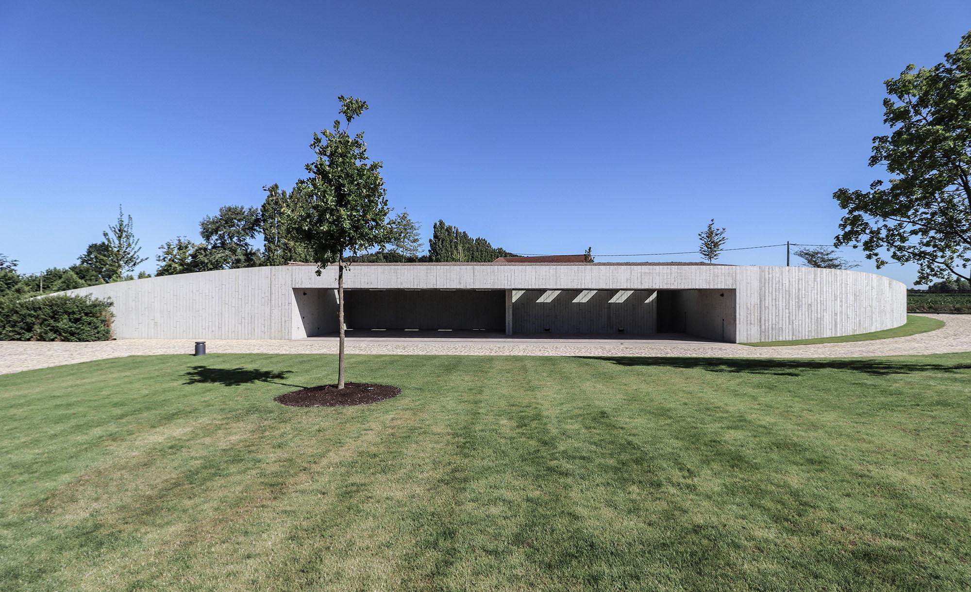 Met dit project willen we in de context van de landelijke omgeving van Roeselare een gepaste inplanting bieden voor de hobbystal. Vanaf de straat is enkel de groene heuvel zichtbaar. Langs de privézijde manifesteert het geheel zich als één lange golvende betonwand die zowel stal, groenelement en tuinmuur omvat.
