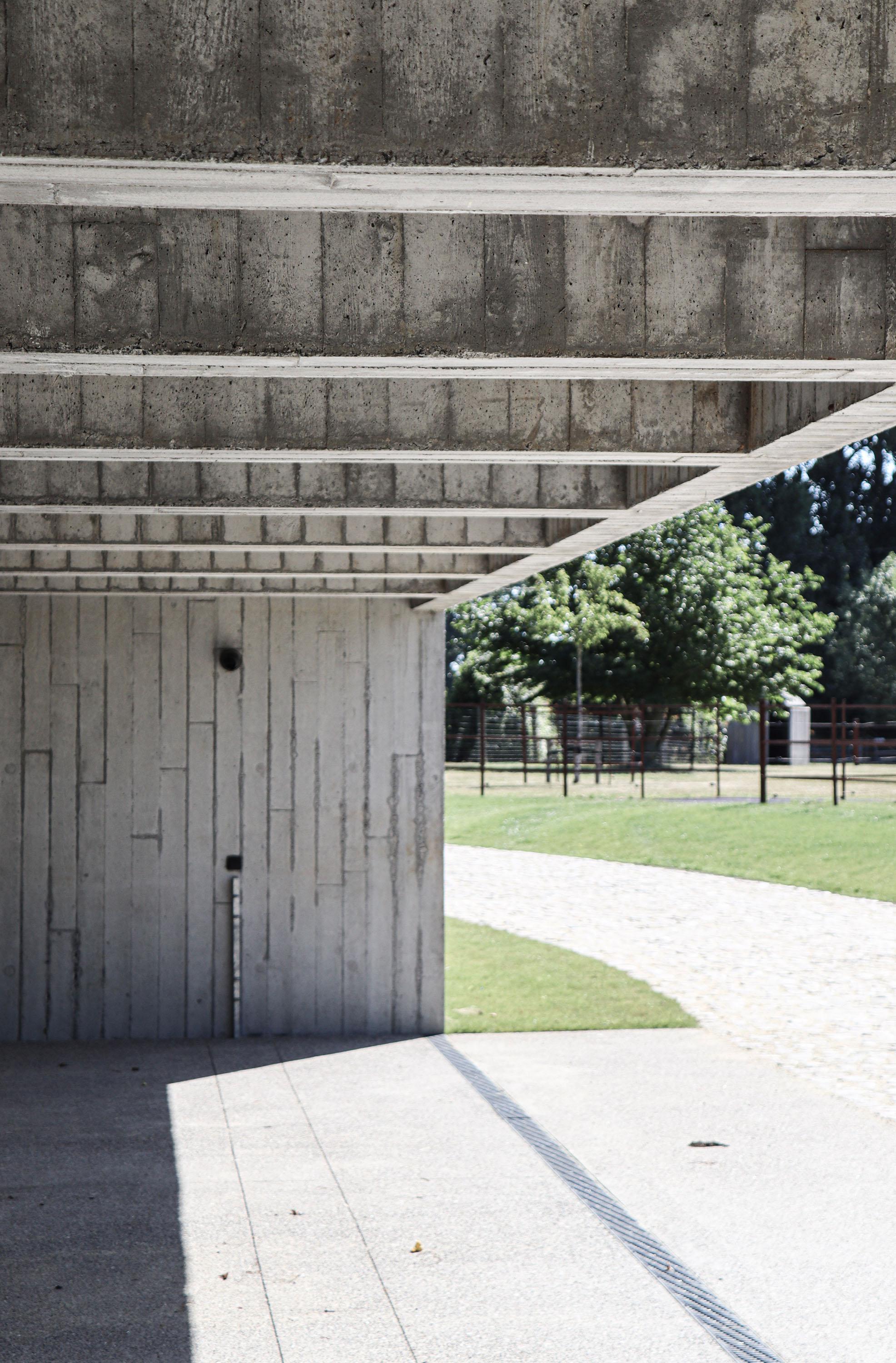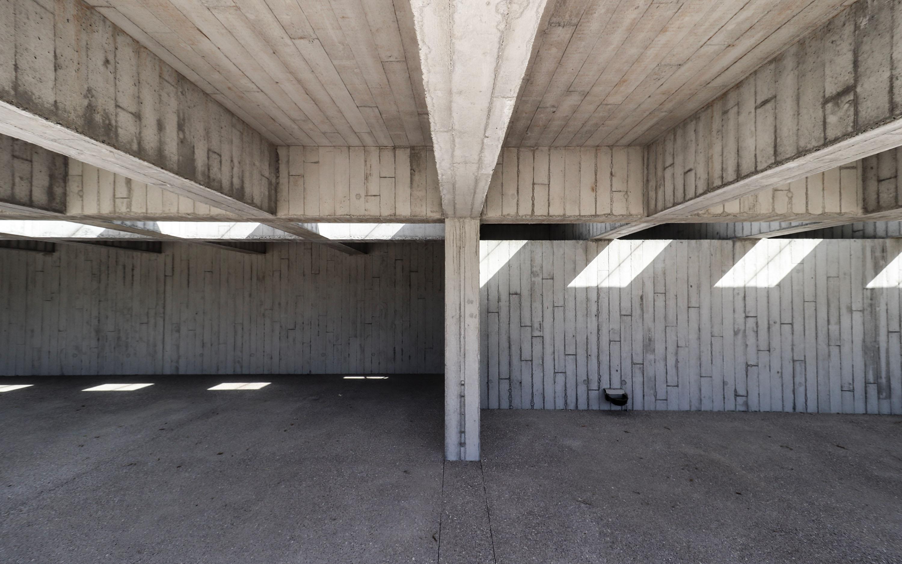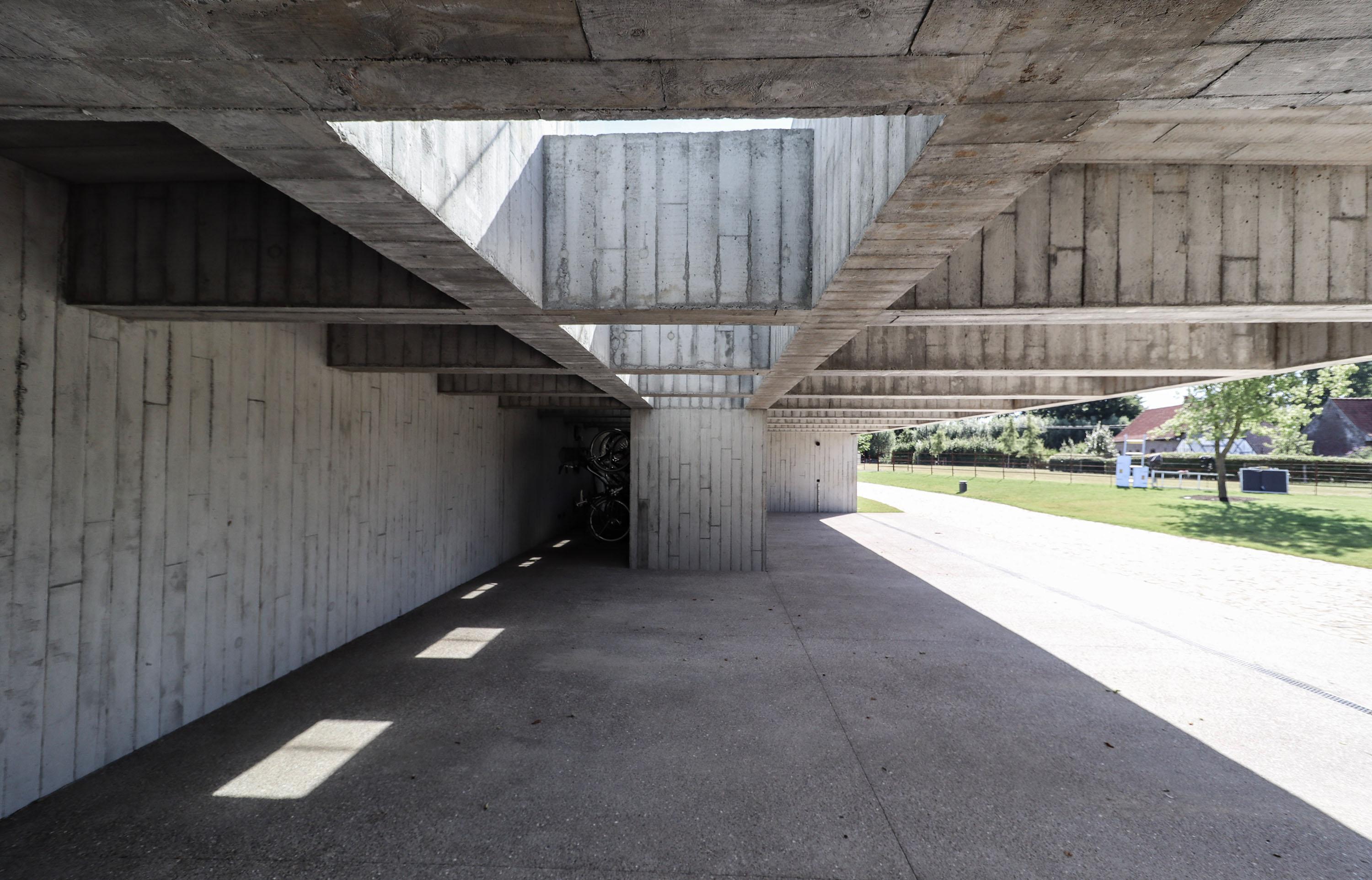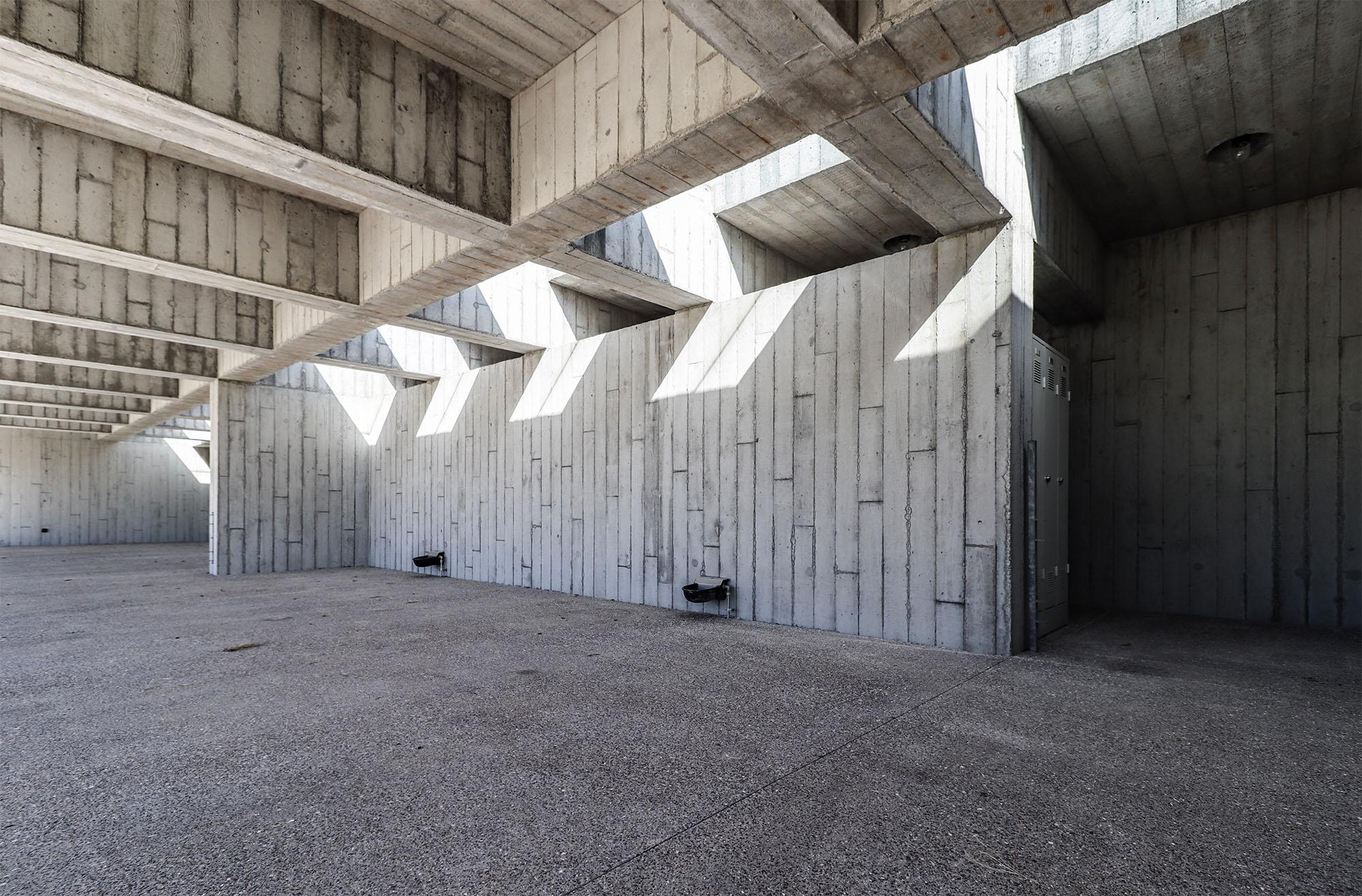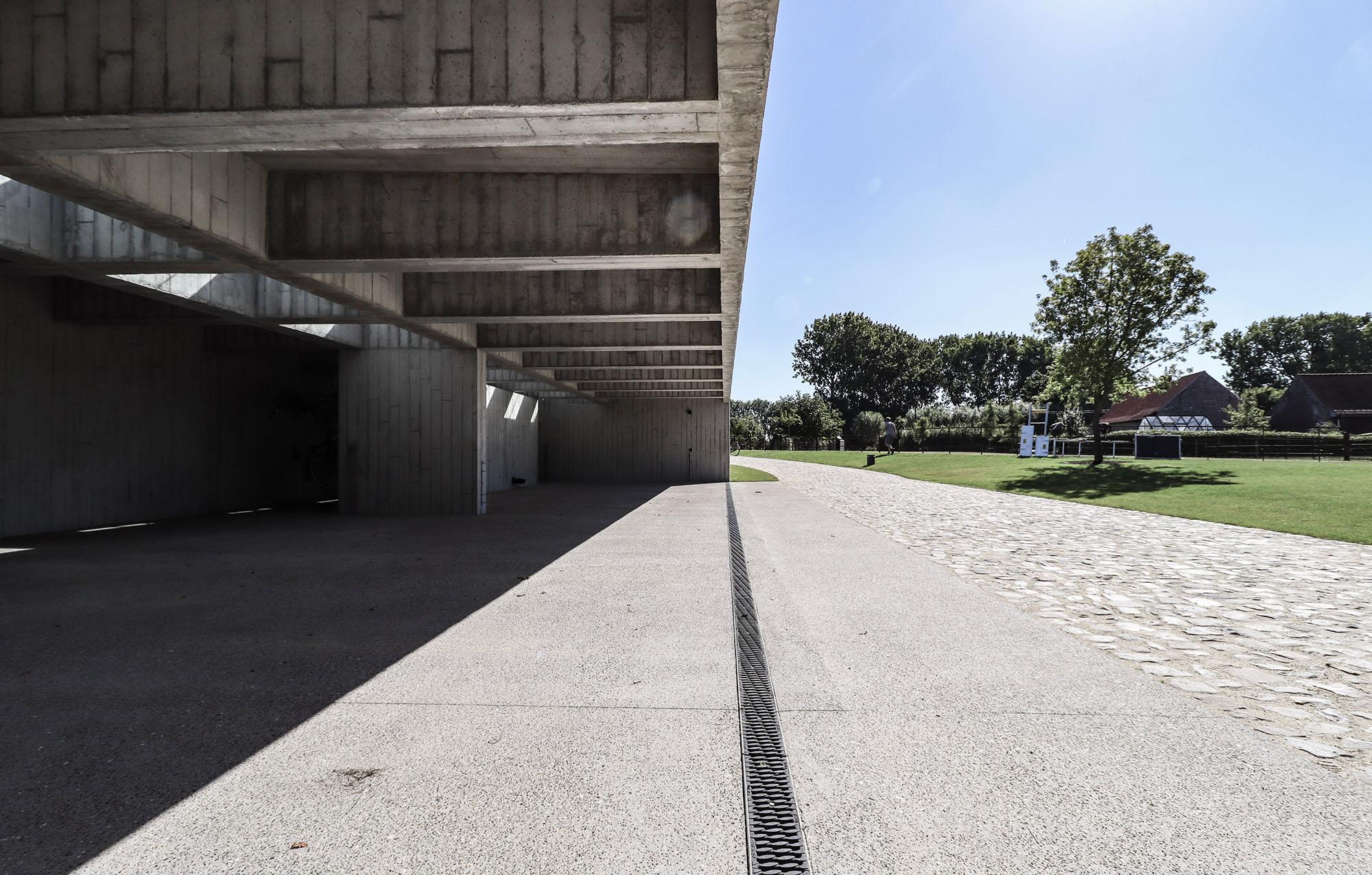 Het materiaal van de muur en de stal is een lichtgrijs beton met een plankentextuur. Het groendak draagt op een uitgesproken balkenstructuur die steunt op de zijwanden en de L-vormige binnenwand. Een bijna onzichtbaar dakraam brengt licht tot in de achterzijde en accentueert het ritme van de betonstructuur. Elk element van het gebouw heeft een stabiliteitsfunctie. De constructie is de architectuur.