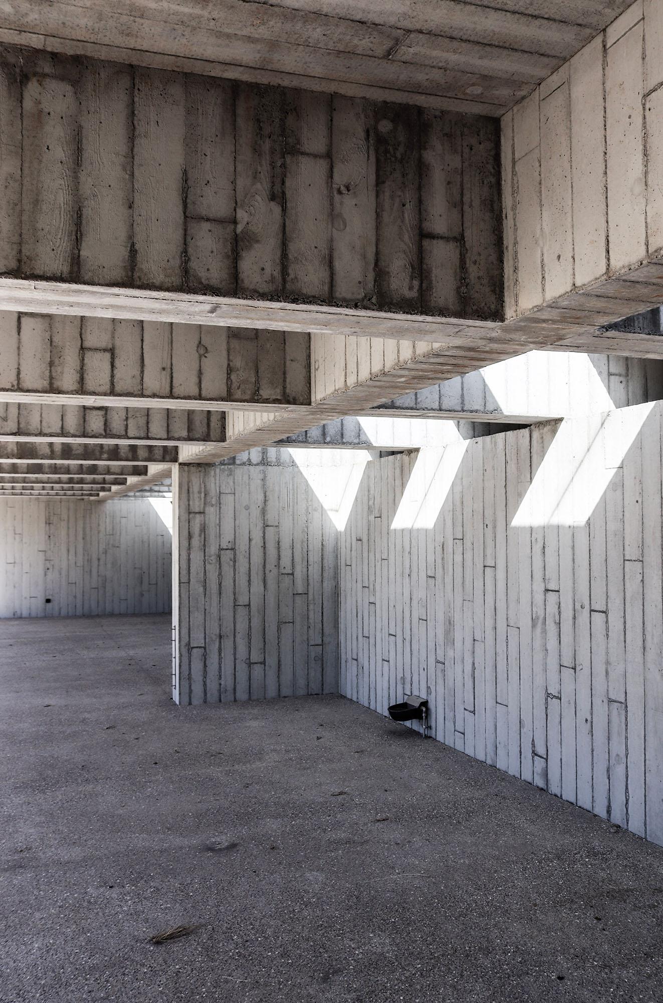 Het materiaal van de muur en de stal is een lichtgrijs beton met een plankentextuur. Het groendak draagt op een uitgesproken balkenstructuur die steunt op de zijwanden en de L-vormige binnenwand. Een bijna onzichtbaar dakraam brengt licht tot in de achterzijde en accentueert het ritme van de betonstructuur. Elk element van het gebouw heeft een stabiliteitsfunctie. De constructie is de architectuur.